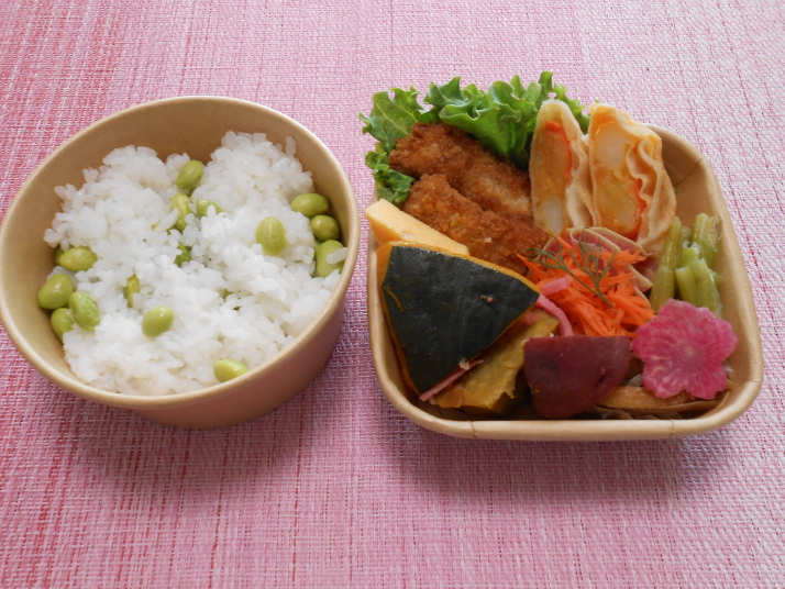 | ヒレカツ カレーポテト春巻き かぼちゃとさつまいもの揚げからめ 卵焼き 小松菜のあえもの きんぴらごぼう キャロットラペ 枝豆ごはん |